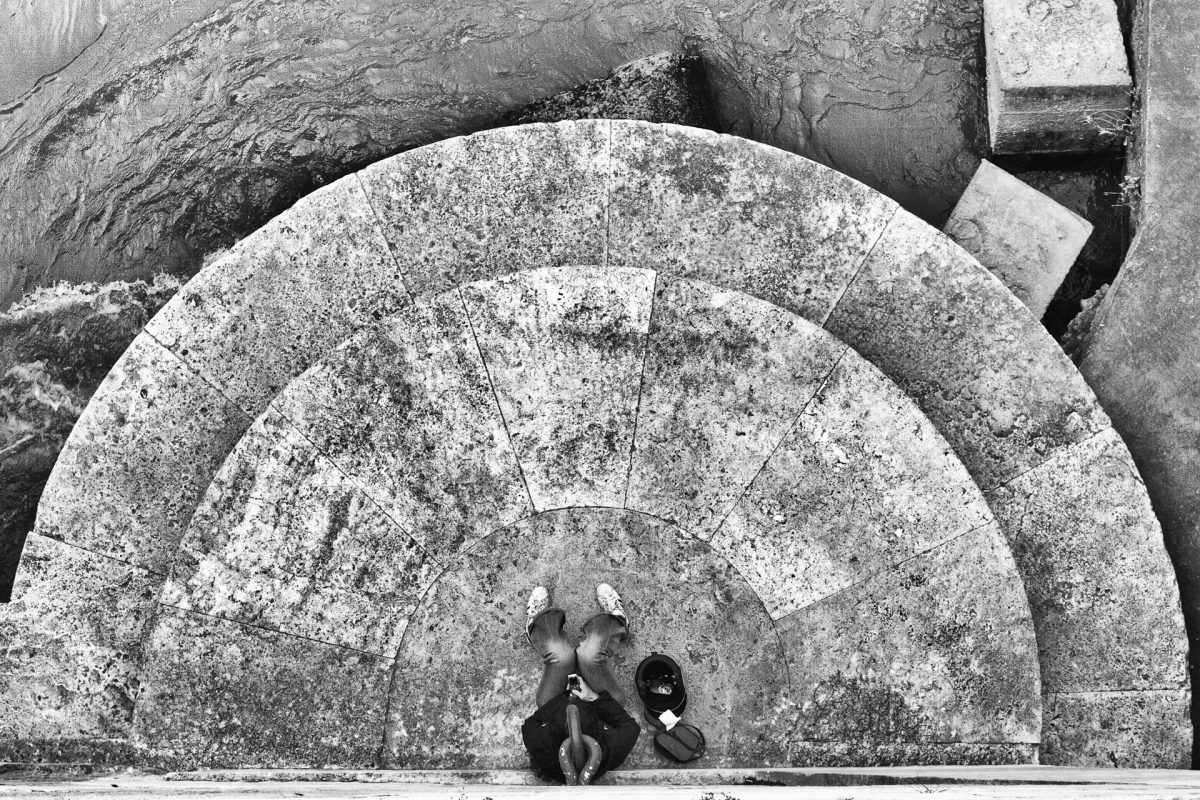 A palladium print of Person on Mobile Phone, taken in 2005 on a bridge over the Tiber River in Rome, Italy. The image is 6X9 inches in an 11X14 inch black frame.