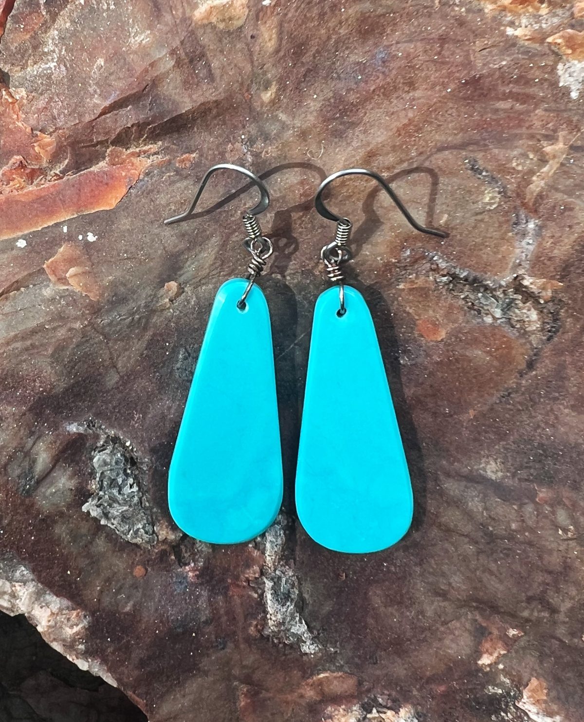 These are nice sized earrings. More elongated but just as pretty in color. Nice light turquoise color that is very uniform. These are turquoise stone slabs that are cut, grinded and polished by the Navajos. The stone is 1.70″ long and just over 1/2″ wide at the bottom. You will love wearing them and they are a POP of spring color! Made in New Mexico and free shipping!