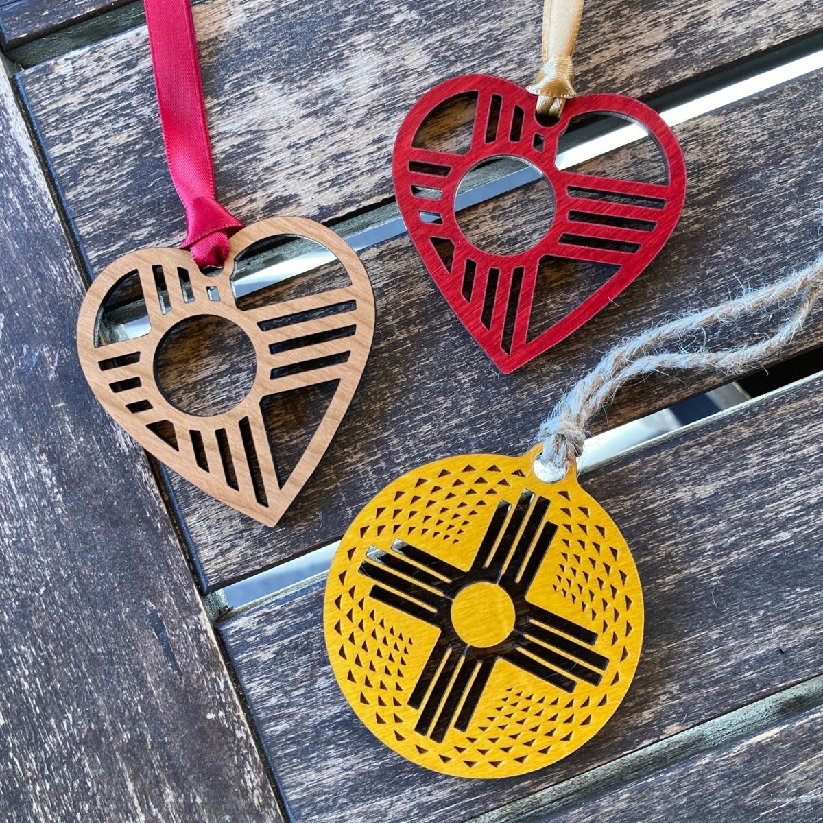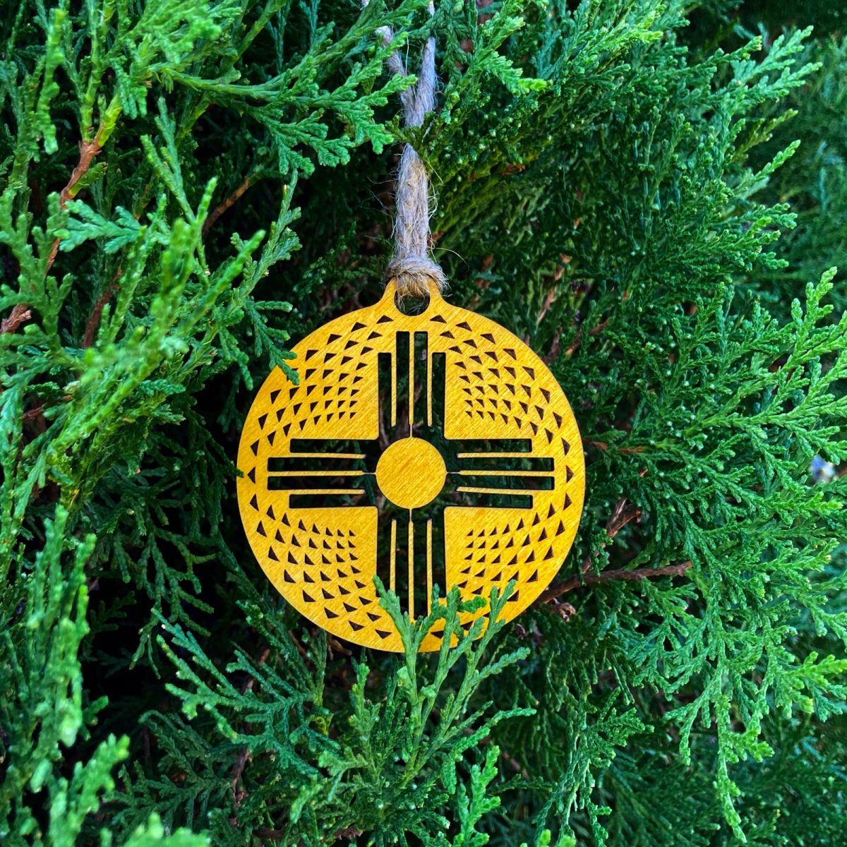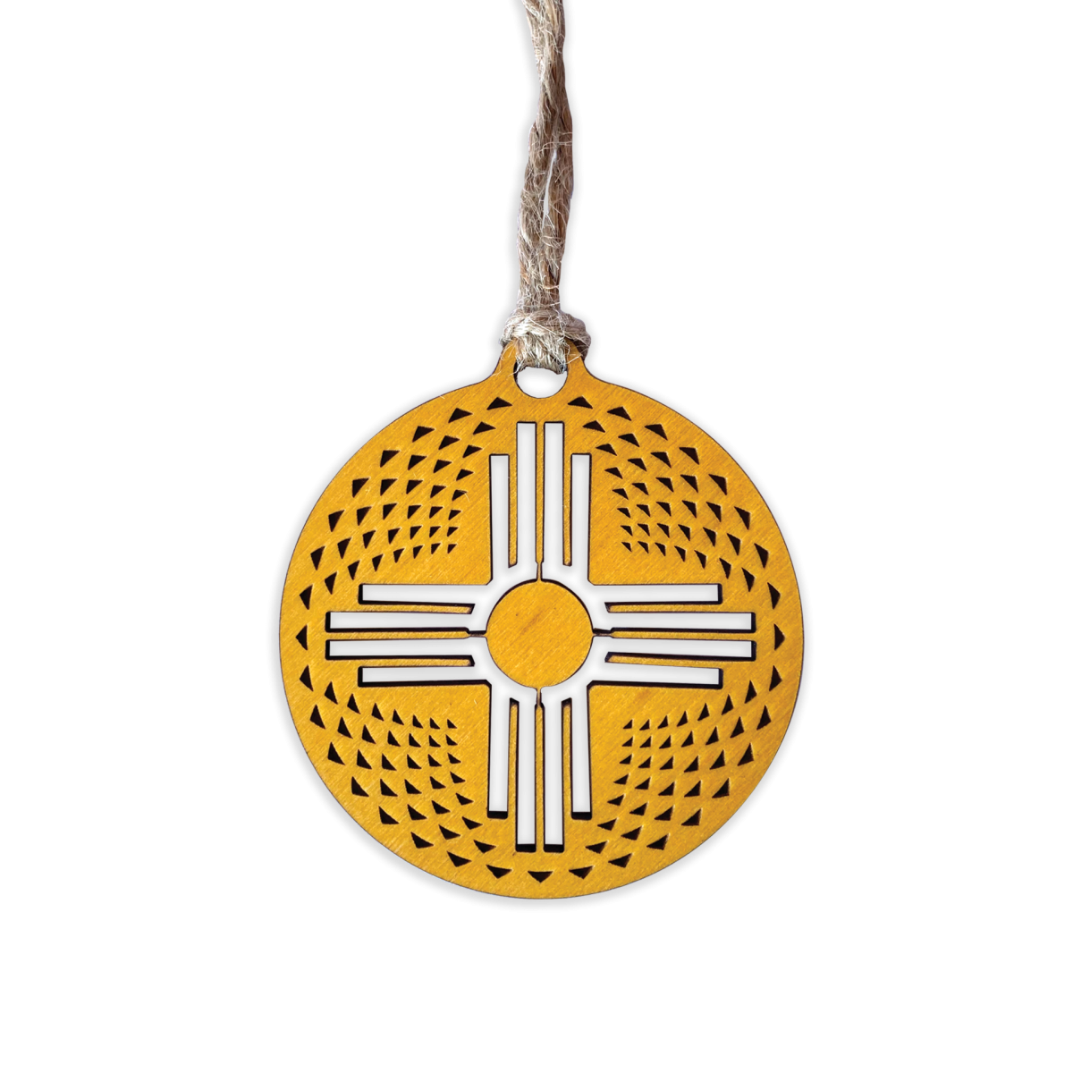 The engraved texture on this Zia ornament is inspired by patterns on New Mexican Pueblo pottery and baskets. Made in New Mexico of birch with a rich yellow stain.