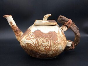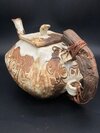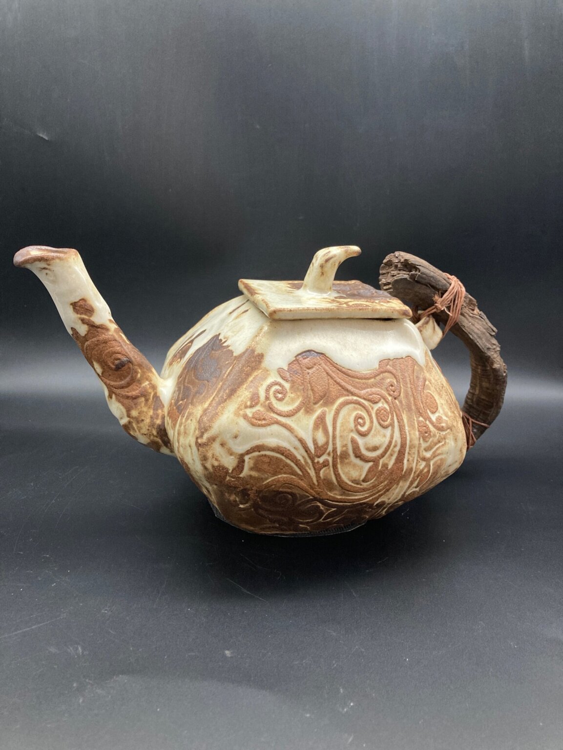 Hand built teapot with pumpkin vine design in yellow anasazi sol. Handle is fashioned with sinew and juniper wood found in the mountains of New Mexico. Size 6 x 11 x 7. Holds 6 cups of tea. Includes 2 cups.