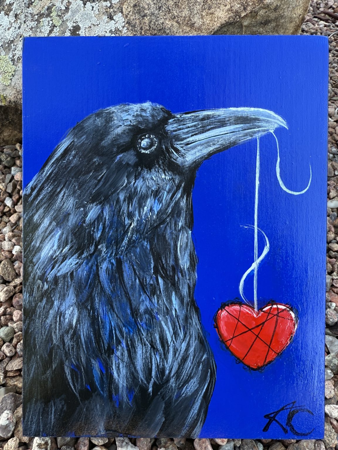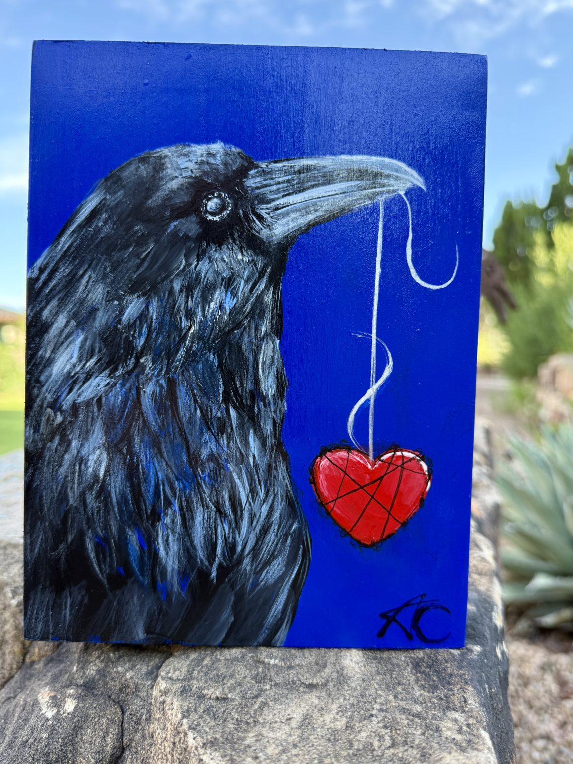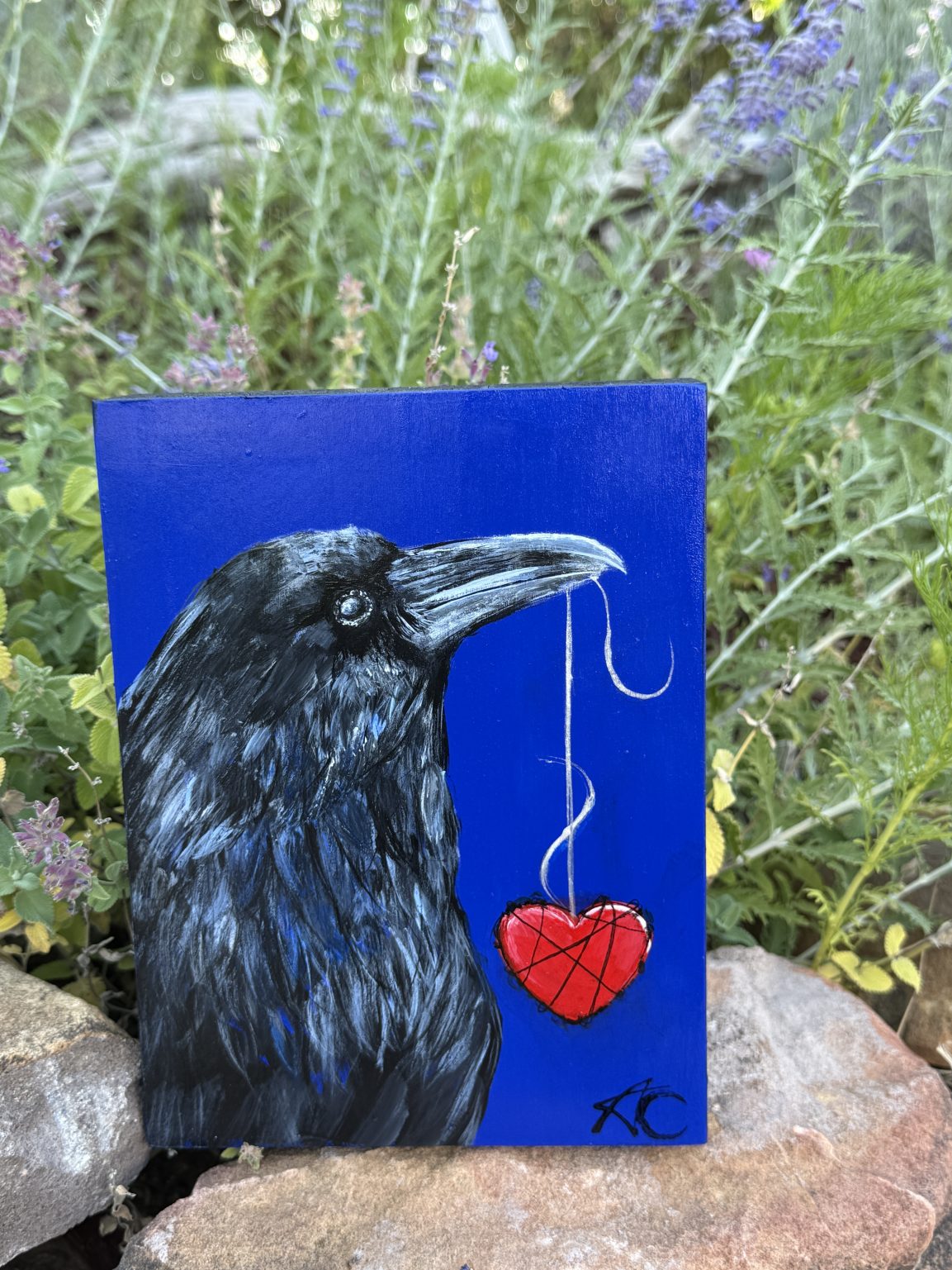 Pure Love was born from those quiet moments on the ranch when ravens gather near — their dark wings gleaming blue in the desert light. I’ve always felt they carry messages of remembrance and renewal, bridging earth and spirit. As I painted, I imagined the raven gently holding love itself — a symbol of how we keep tending the heart through every joy, loss, and transformation. This piece reminds me that love, once given, never fades; it simply expands, circling back in new and unexpected ways.