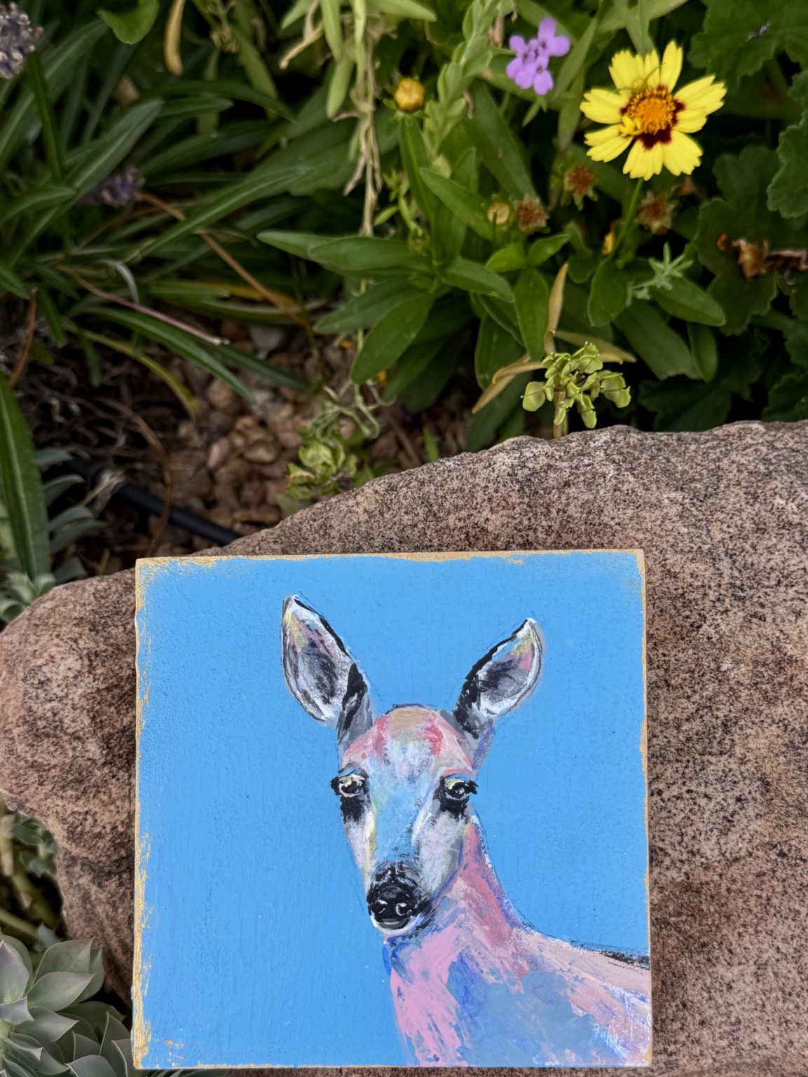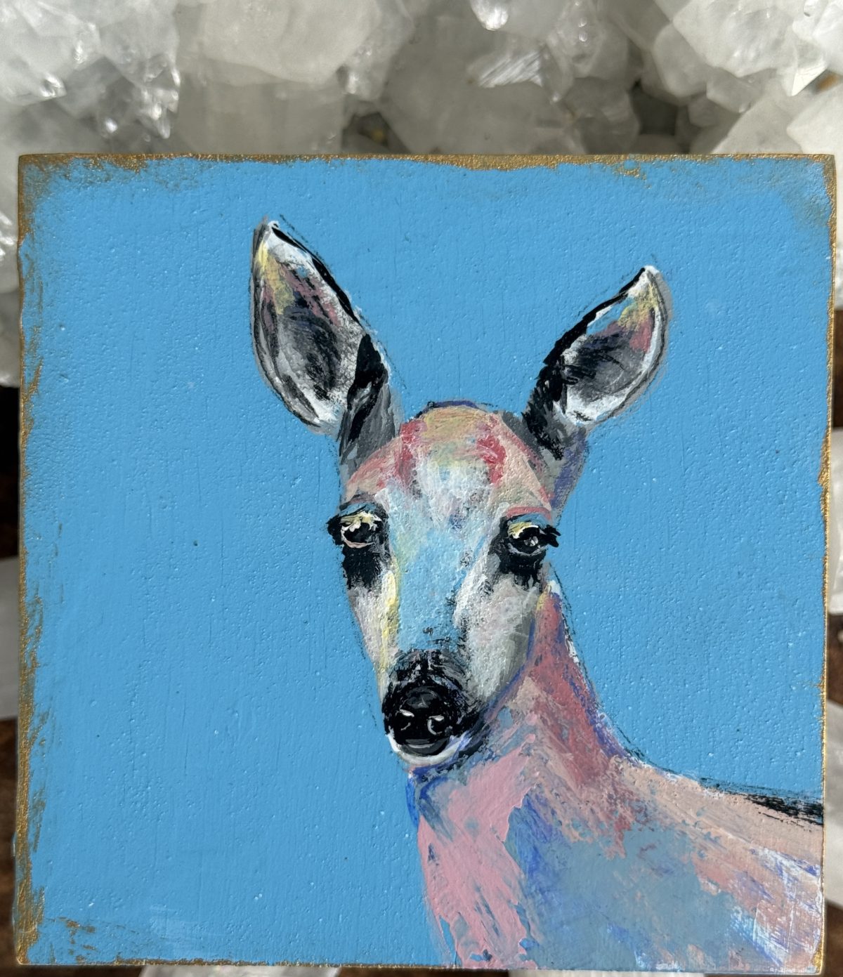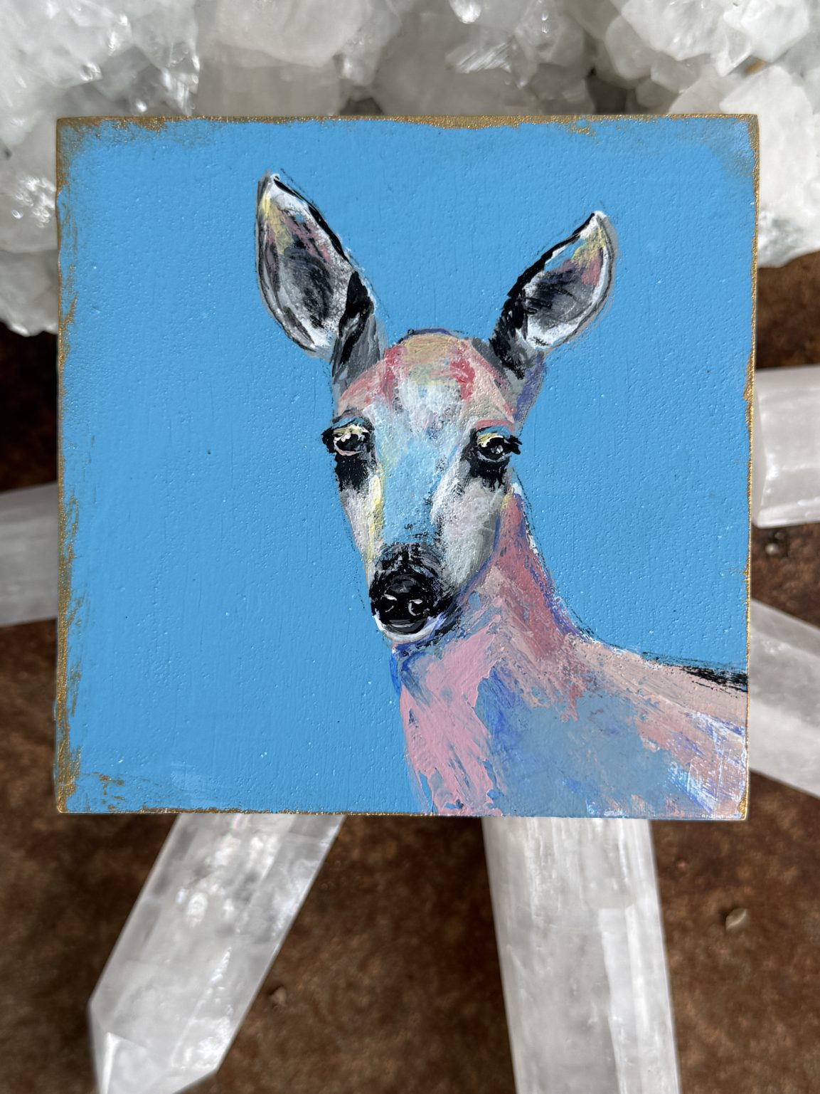 The inspiration for Pure came from the deer that wander down from the mountains to my ranch, especially during dry spells when they search for water. There’s a quiet reverence in those moments — their grace, their stillness, the trust in their eyes. This painting is my way of honoring that purity of spirit, a reflection of gentleness and presence within the wild desert landscape I call home.