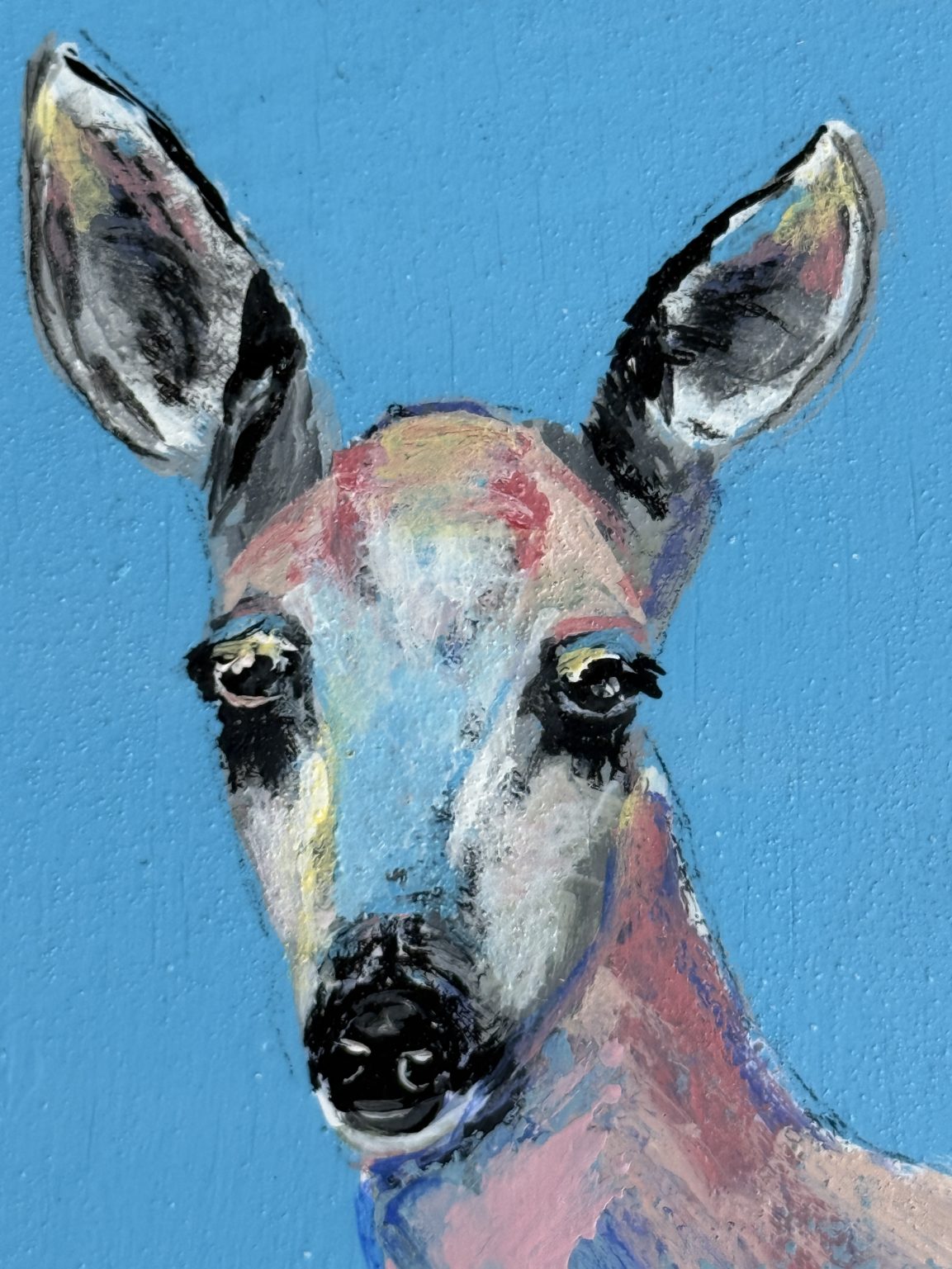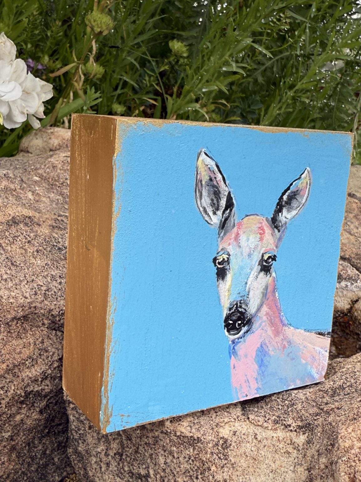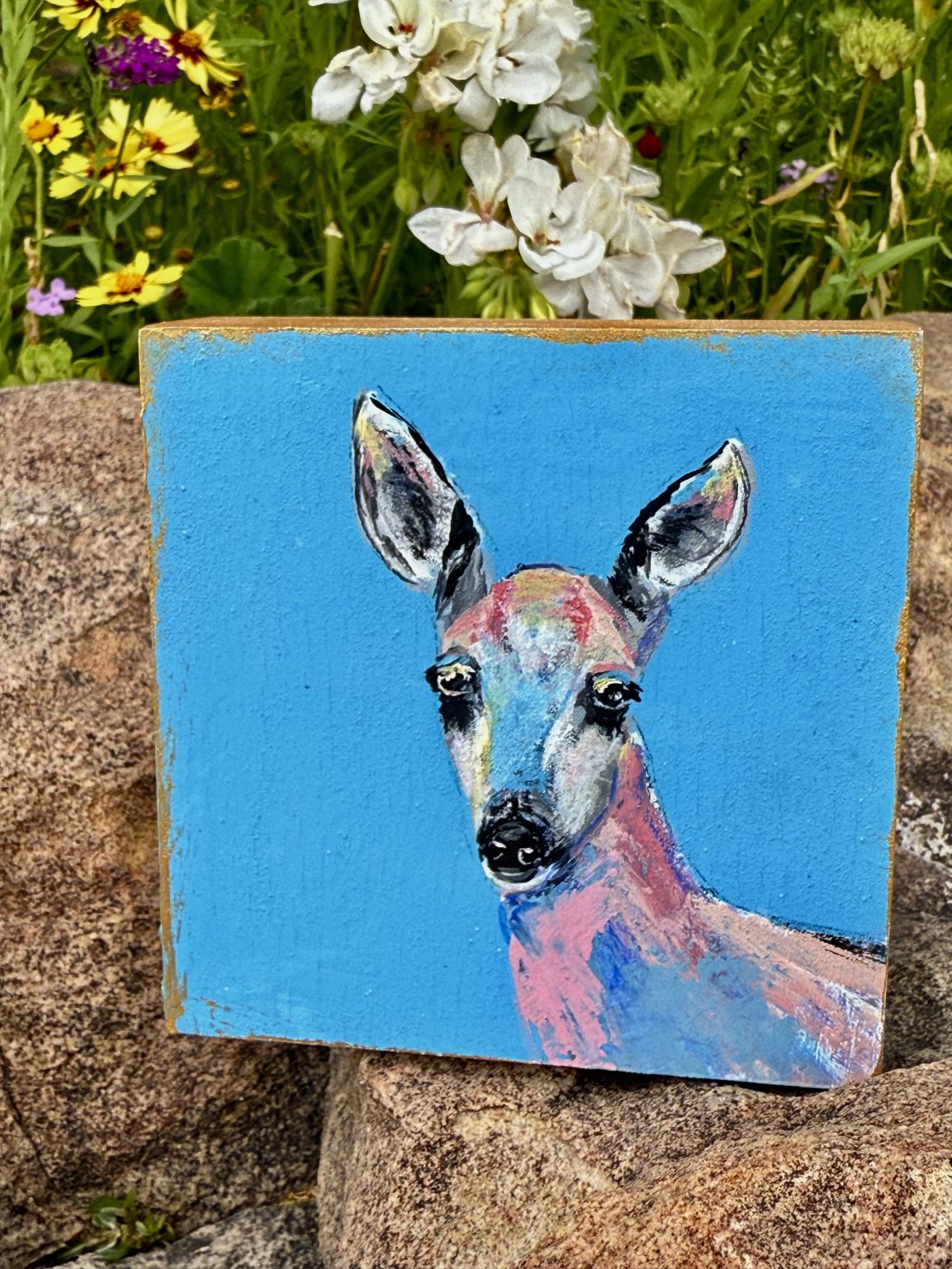 The inspiration for Pure came from the deer that wander down from the mountains to my ranch, especially during dry spells when they search for water. There’s a quiet reverence in those moments — their grace, their stillness, the trust in their eyes. This painting is my way of honoring that purity of spirit, a reflection of gentleness and presence within the wild desert landscape I call home.