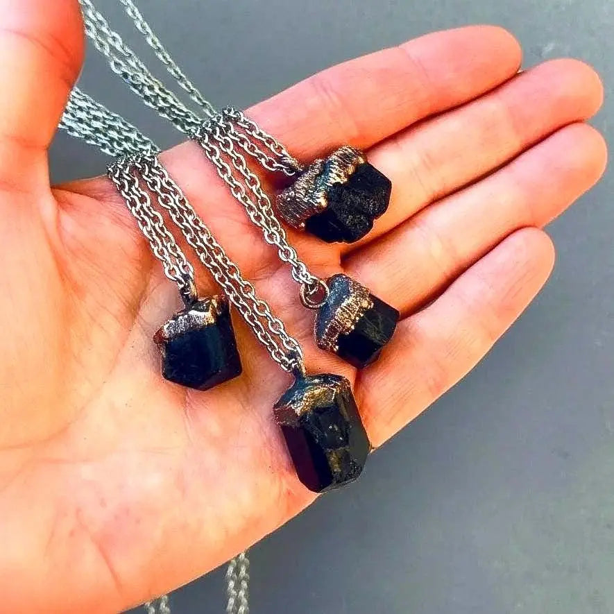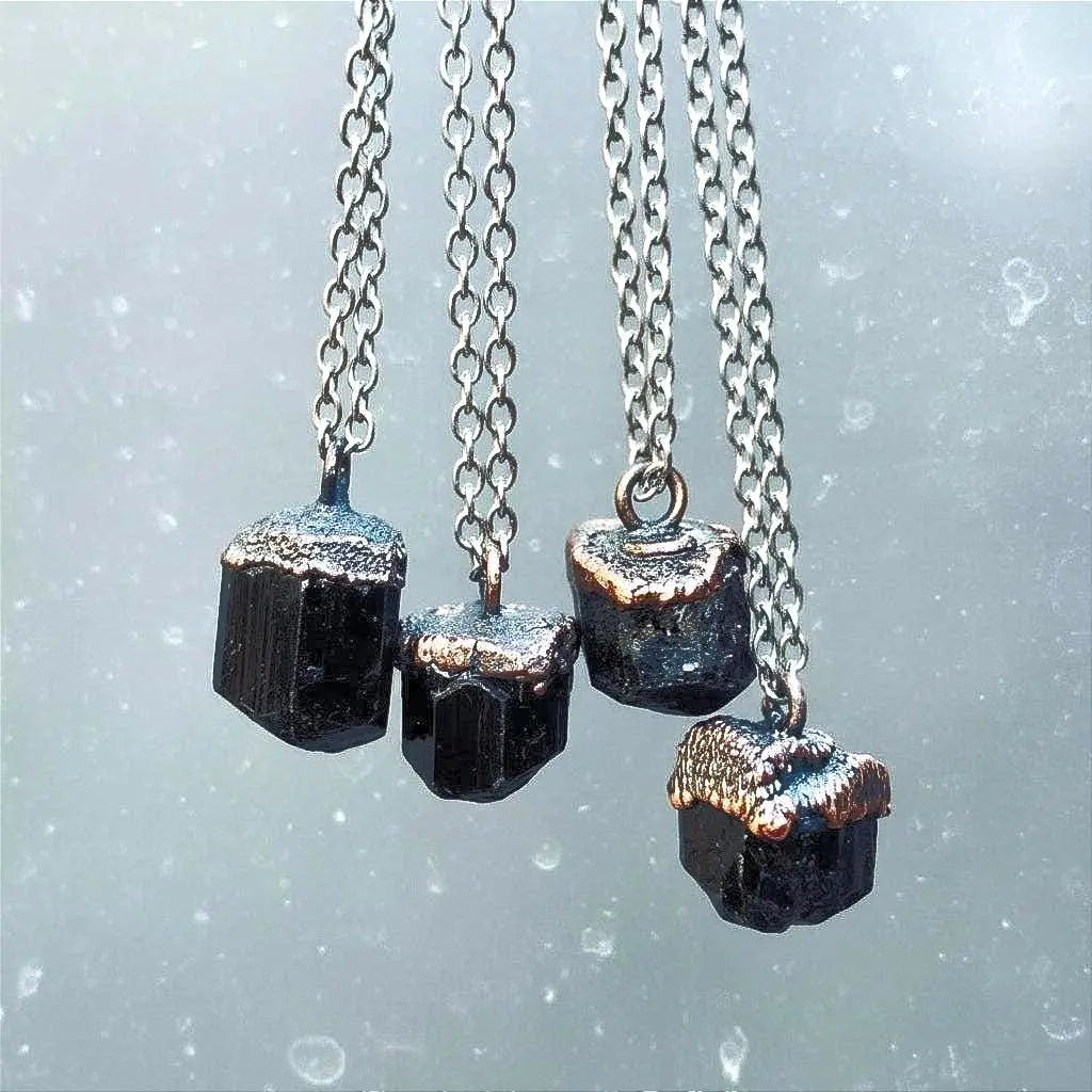 Each Raw Black Tourmaline Necklace is created using a slow electroforming method: copper is gently grown around the raw crystal, preserving every natural facet and jagged silhouette so the stone’s authentic character remains intact. Pieces are hand-finished, given a warm living patina, and sealed with a protective coating to slow oxidation and keep the surface comfortable against skin. The pendant hangs on a stainless steel cable-style chain for durability and balanced weight.