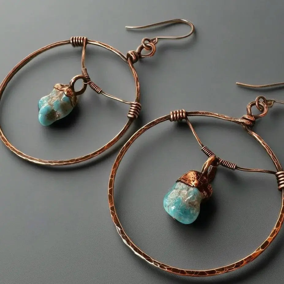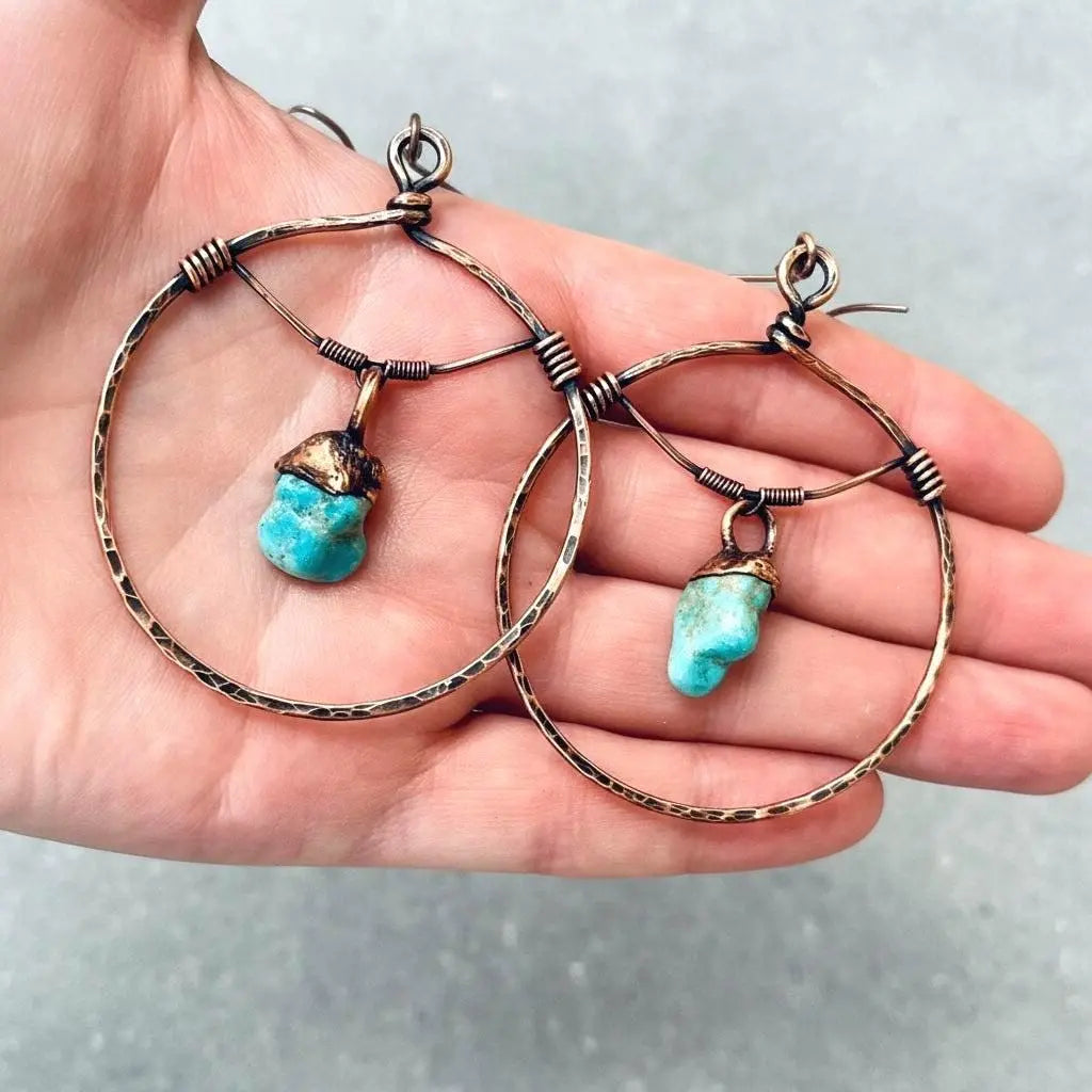 Like a desert morning held close to the ear: these Raw Turquoise Hoop Earrings blend raw crystal energy with copper’s warm embrace, inviting calm, clarity, and grounded balance. Each pair carries a quiet ritual — the cool, serene tones of turquoise paired with botanical, bohemian lines to soothe the spirit and connect you to the earth.