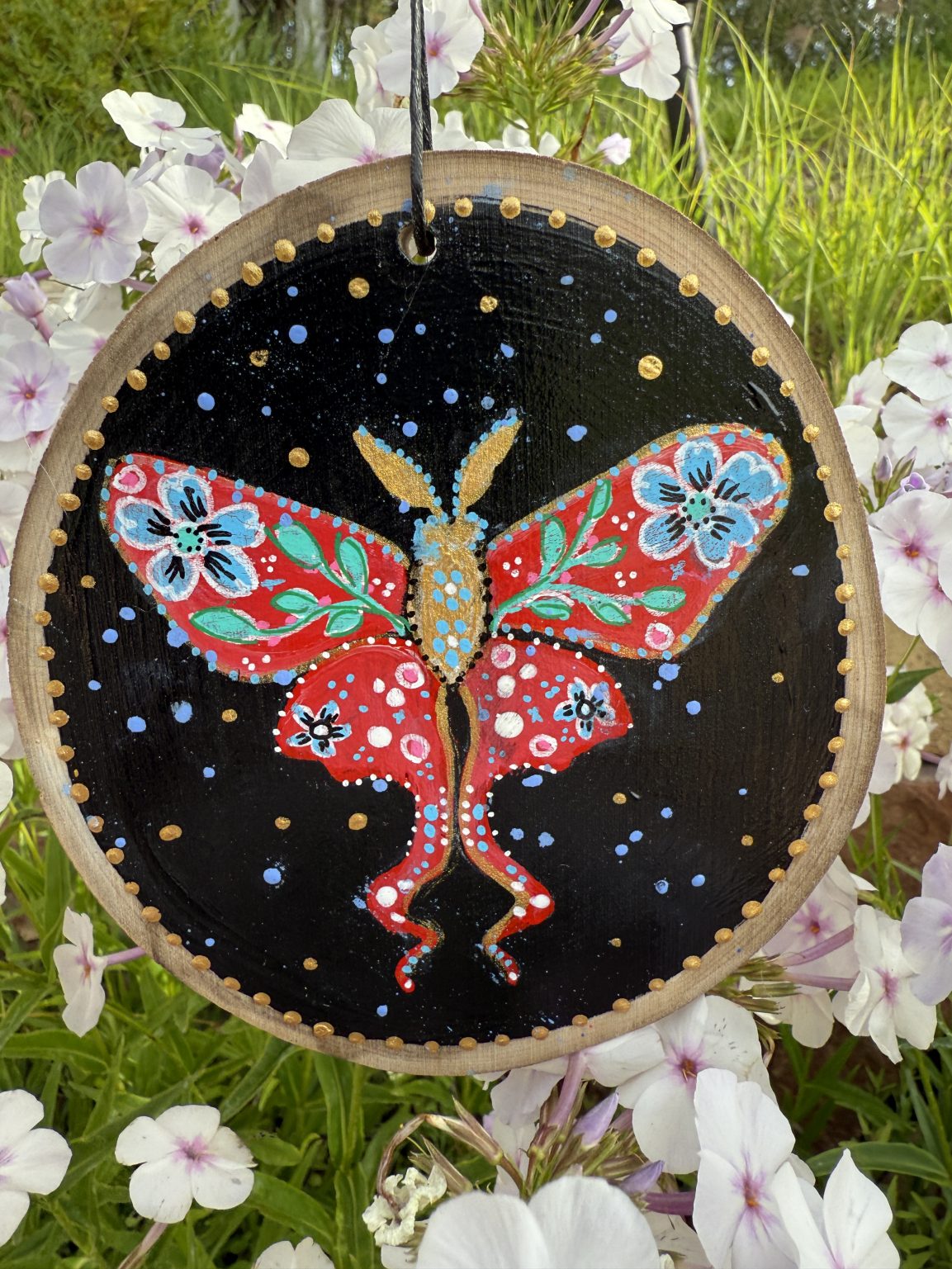 Will make a precious gift for anyone who loves the beauty of nature, the magic of moths and butterflies, and mystical dark night skies. Hang this art piece in a cozy nook in your home, on a door knob, in a window, or anywhere to add an extra touch of nature! Comes ready to hang with a waxed leather black cord.