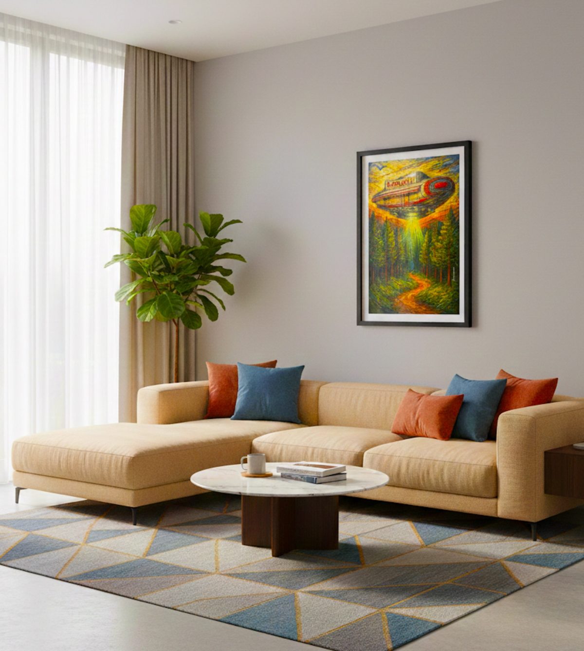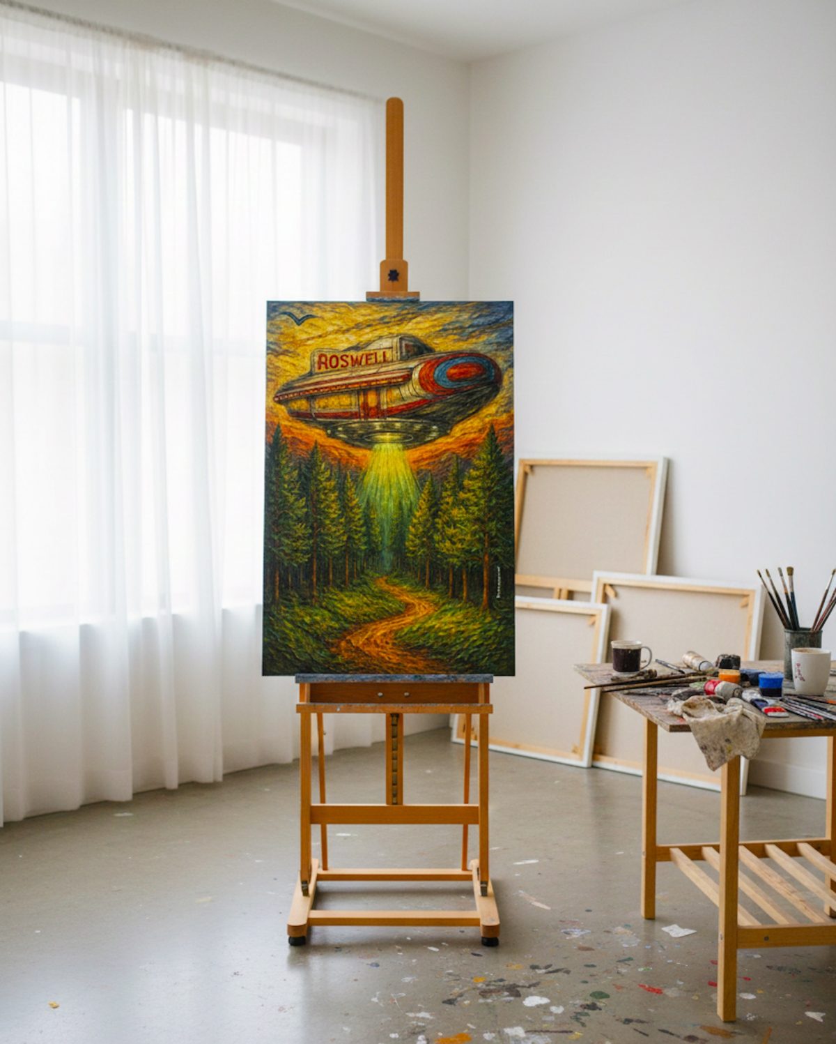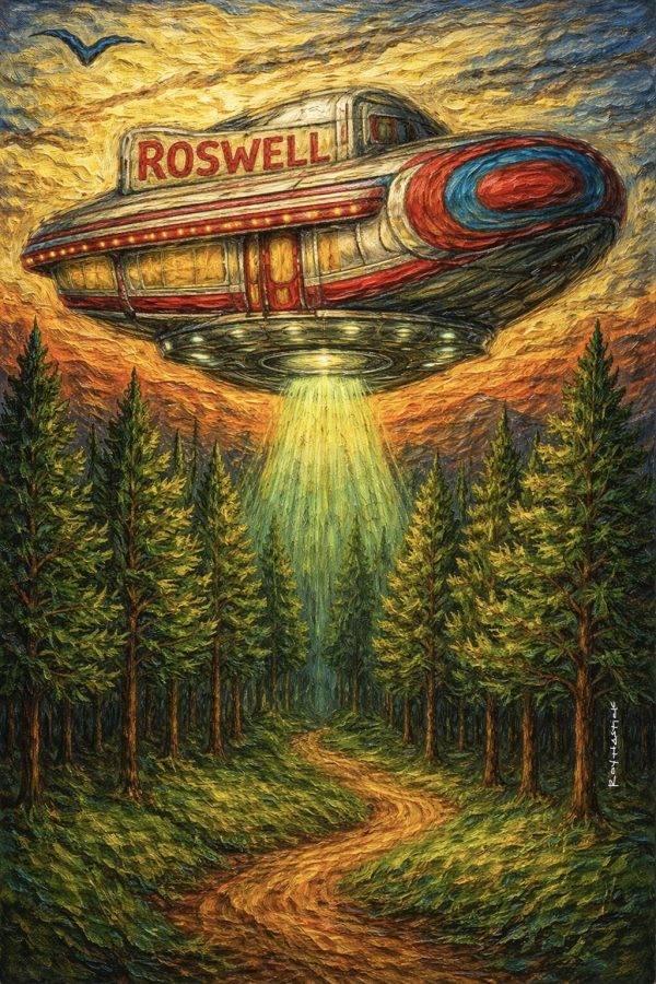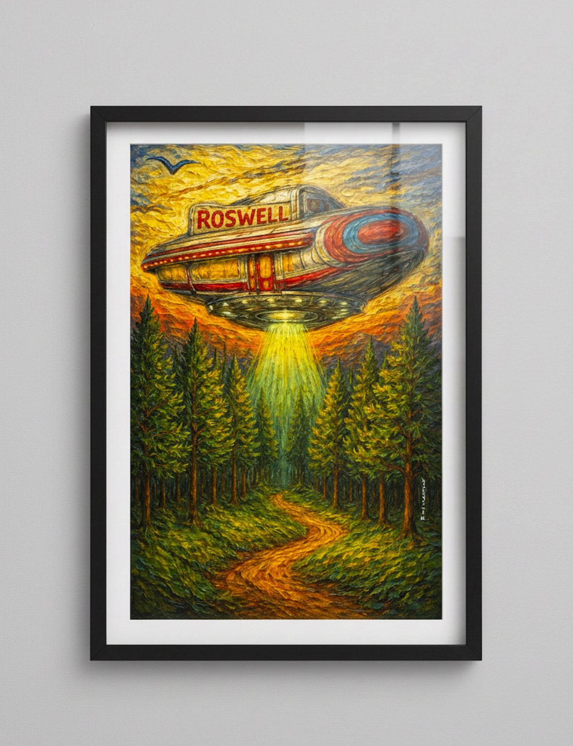This image is a striking example of the Roy Hastick style, blending retro Americana with a textured, almost Van Gogh-esque post-impressionist energy. It captures a whimsical yet mysterious scene of a UFO hovering over a forest path.