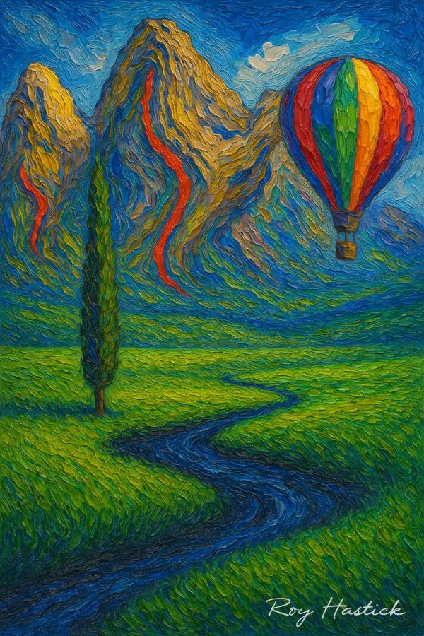 The background is dominated by towering, rugged mountain peaks rendered in golden ochre and tan, accented with bold streaks of crimson that suggest deep crevices or mineral deposits. A rainbow-striped hot air balloon floats gracefully in the upper right, adding a sense of whimsy and adventure to the scene. The sky and the mountains are treated with the same energetic, Van Gogh-esque movement, making the entire environment feel alive and pulsing with light.