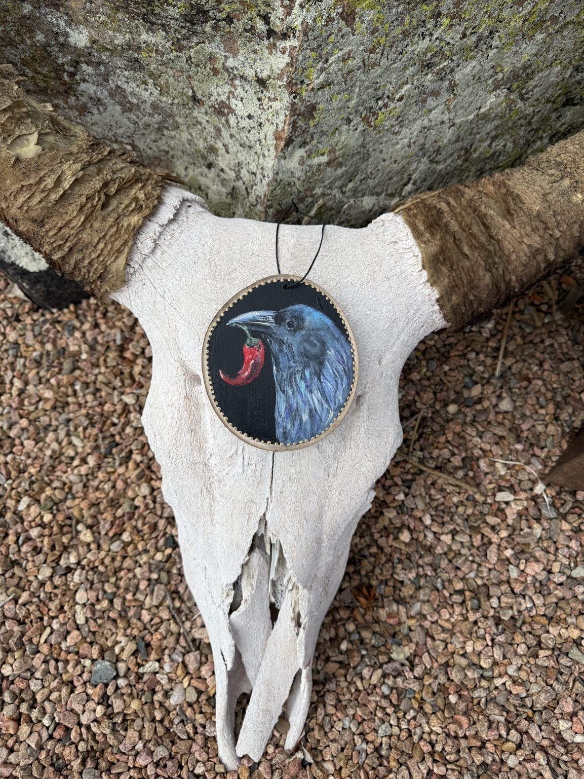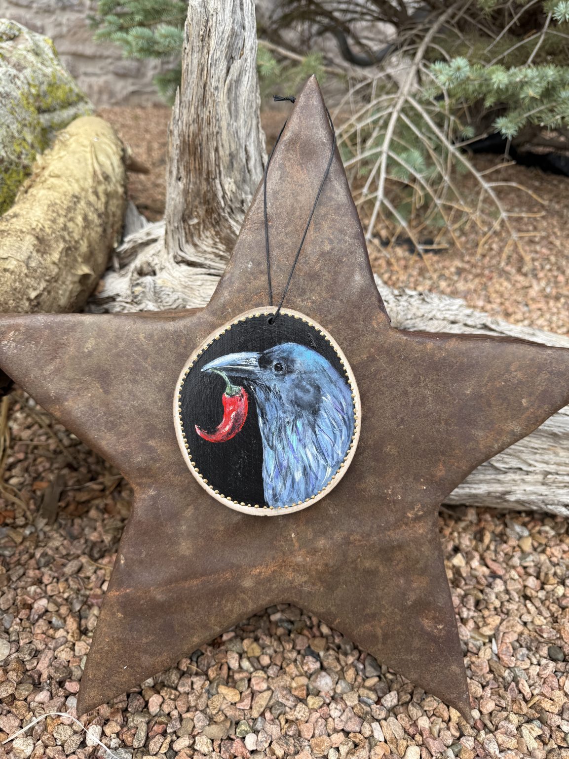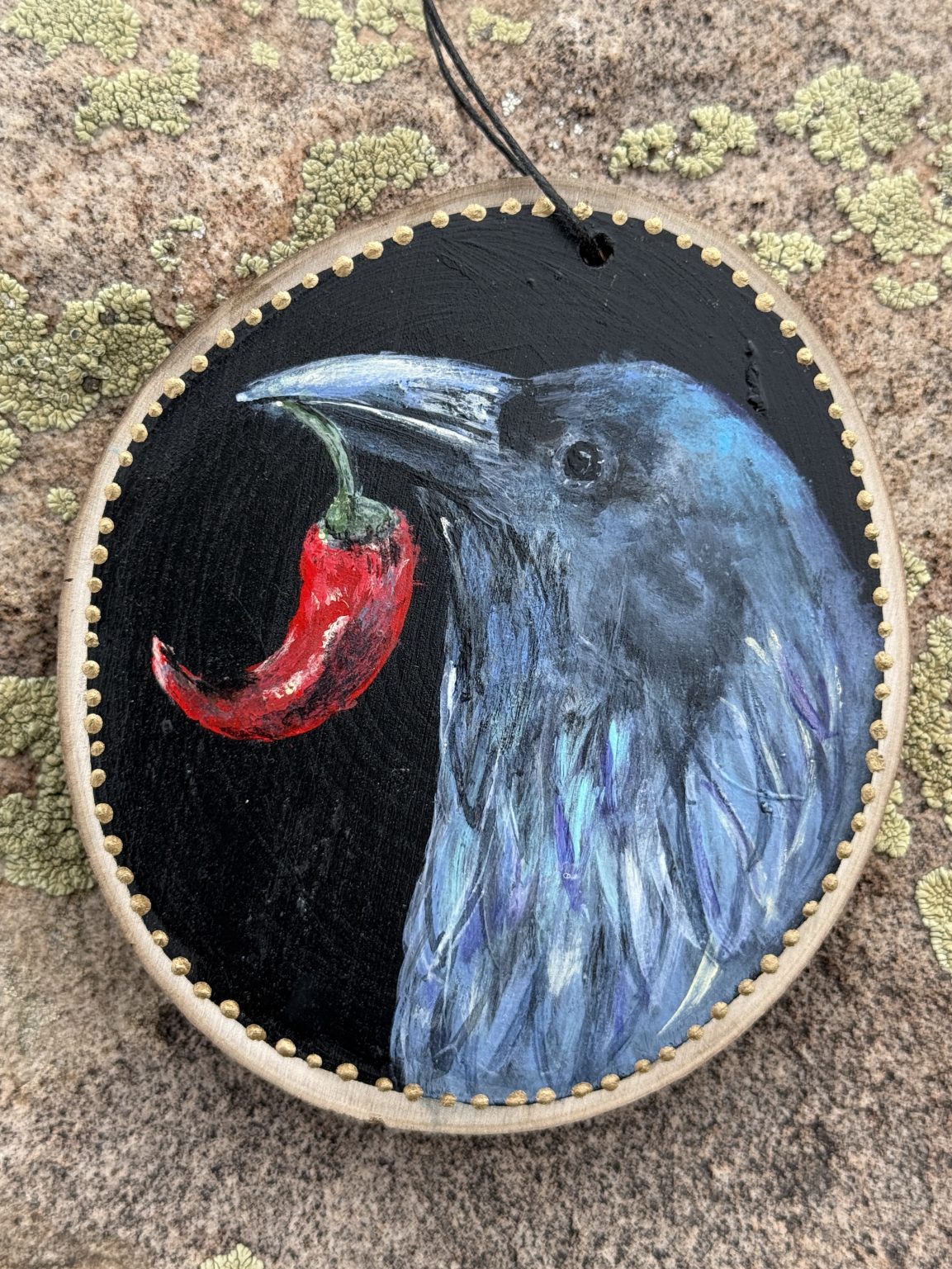 This original meticulously painted wood slice showcases a kind-eyed Raven holding a red Chile Pepper depicted in a contemporary modern art style. This wood slice is ideal for home door knob or window decor, holiday ornament, or meaningful handmade one-of-a-kind gift.