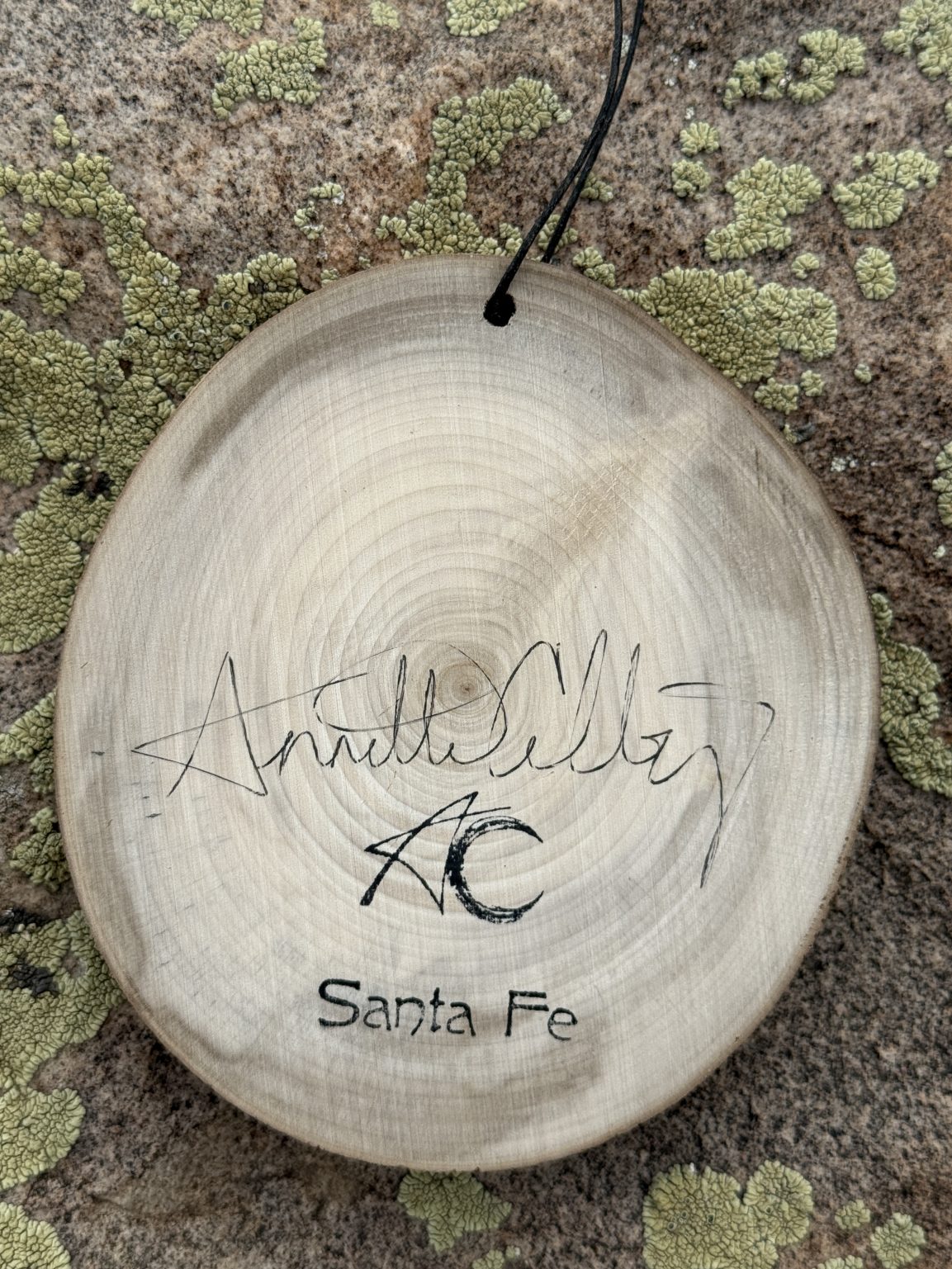 Hand-painted by Annette Colby on an Aspen wood slice from the mountains of Northern New Mexico with acrylic paint and acrylic sealer, waxed leather cord, love and magic .