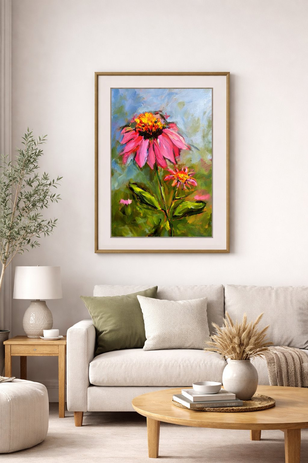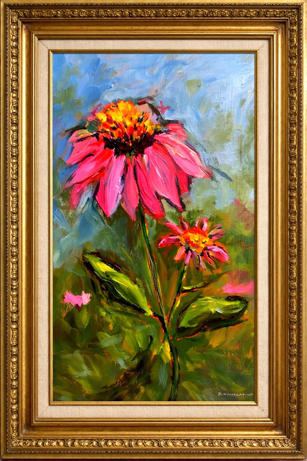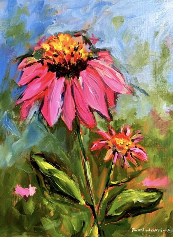 An expressive oil or acrylic painting of two coneflowers (echinacea) set against a hazy, atmospheric background. The larger bloom dominates the upper center, featuring thick, gestural strokes of vivid magenta and hot pink for the petals, crowned by a textured, fiery orange and yellow center. A smaller companion bloom sits lower to the right. The greenery is rendered in deep forest and lime greens with rapid, vertical brushwork, while the sky transitions from a serene cerulean blue to earthy, mottled tones. The piece is characterized by its impasto technique, where the heavy application of paint creates a physical sense of rhythm and life.
