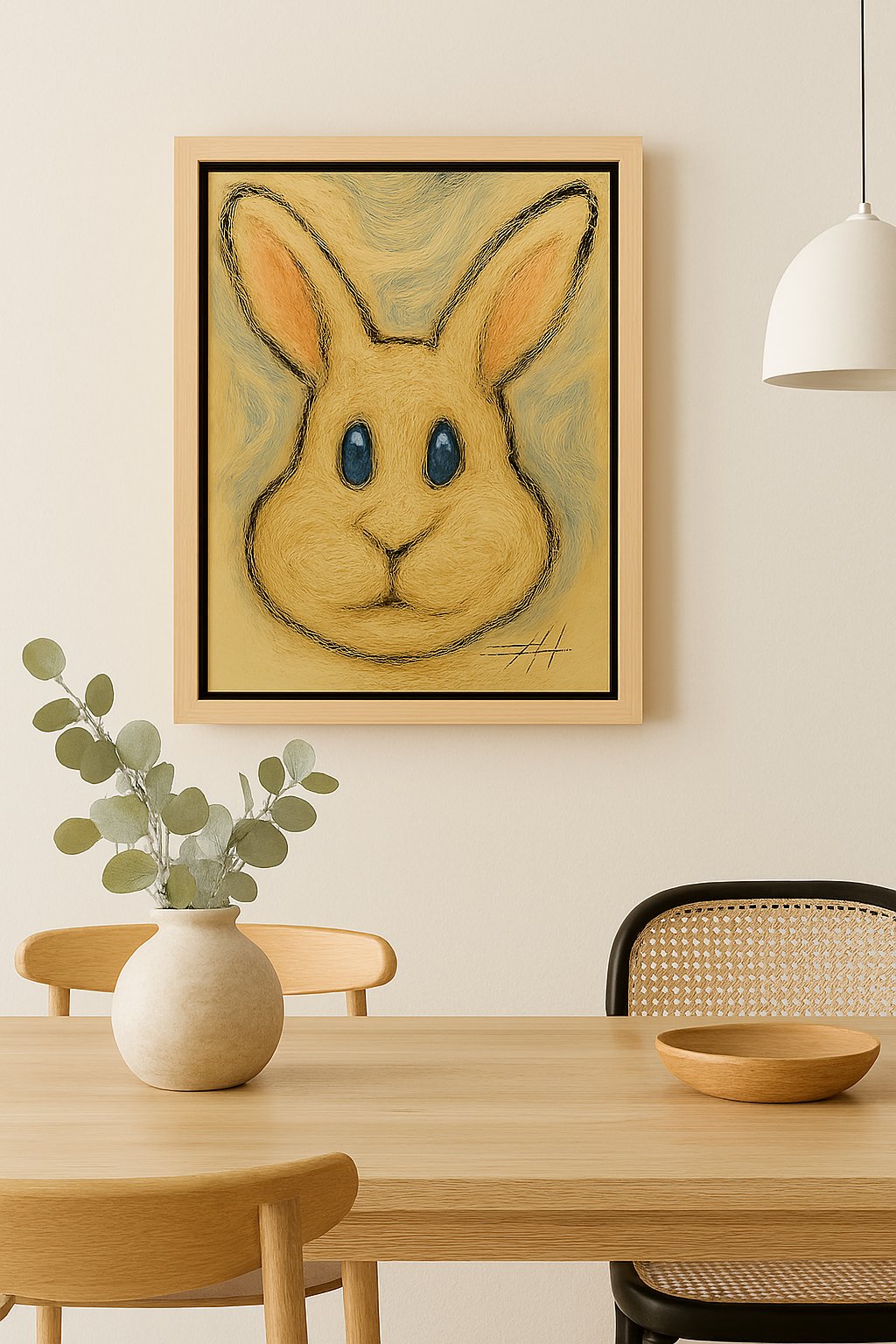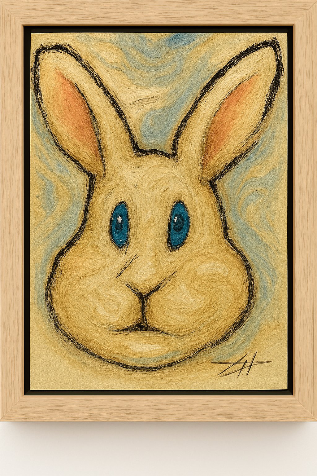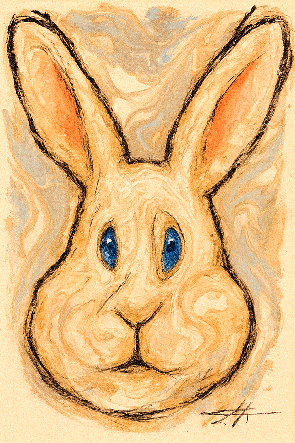 This illustration of a rabbit’s face features a textured, swirling application of warm ochre and cream tones, contrasted by deep blue eyes and a soft, gestural background.