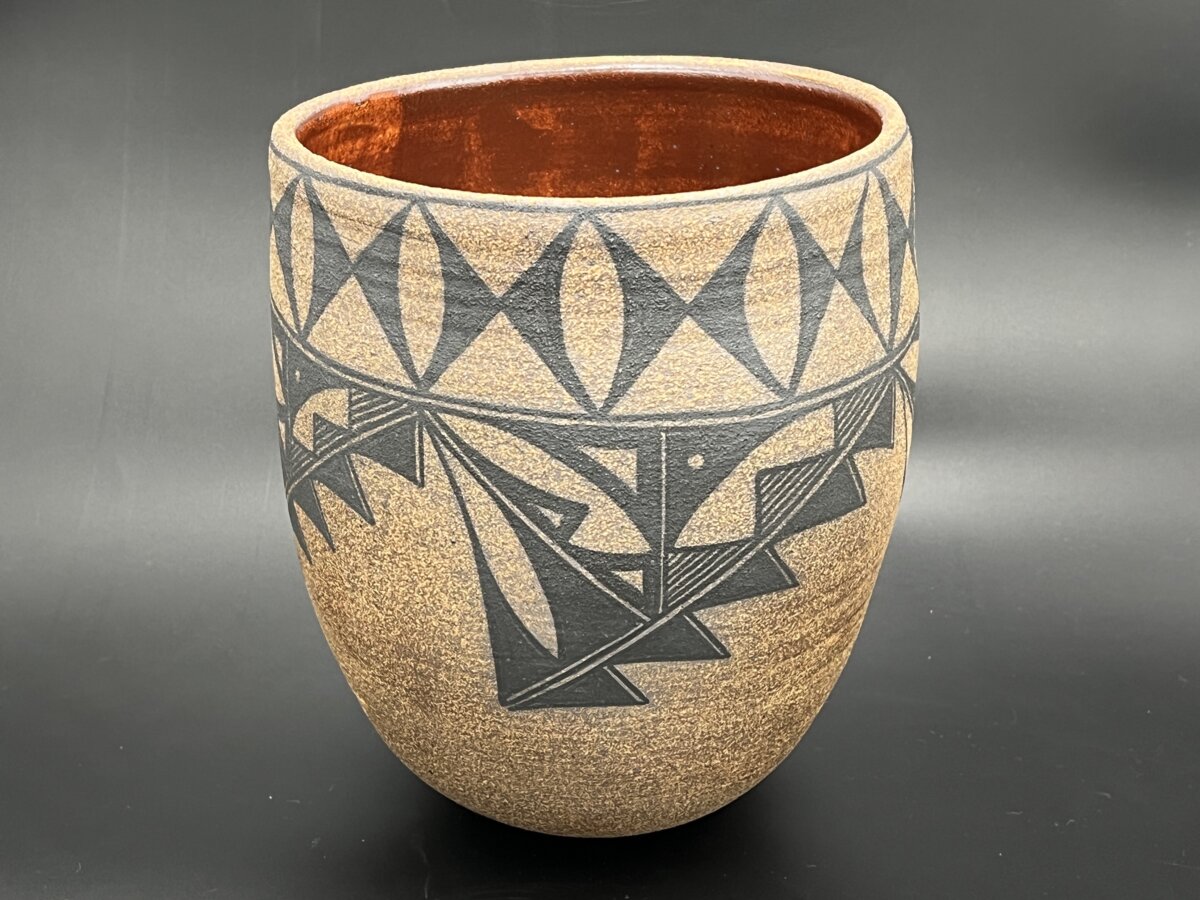 This decorative piece is a collaboration between Santa Fe ceramic artist Angela Smith Kirkman who threw the form on a potter’s wheel and native artist Zelda Garcia who painted the design with a brush made from the yucca plant, the manner traditional in her ancestorial home Acoma, New Mexico. Her designs on this vessel symbolize pueblo homes and rain clouds.