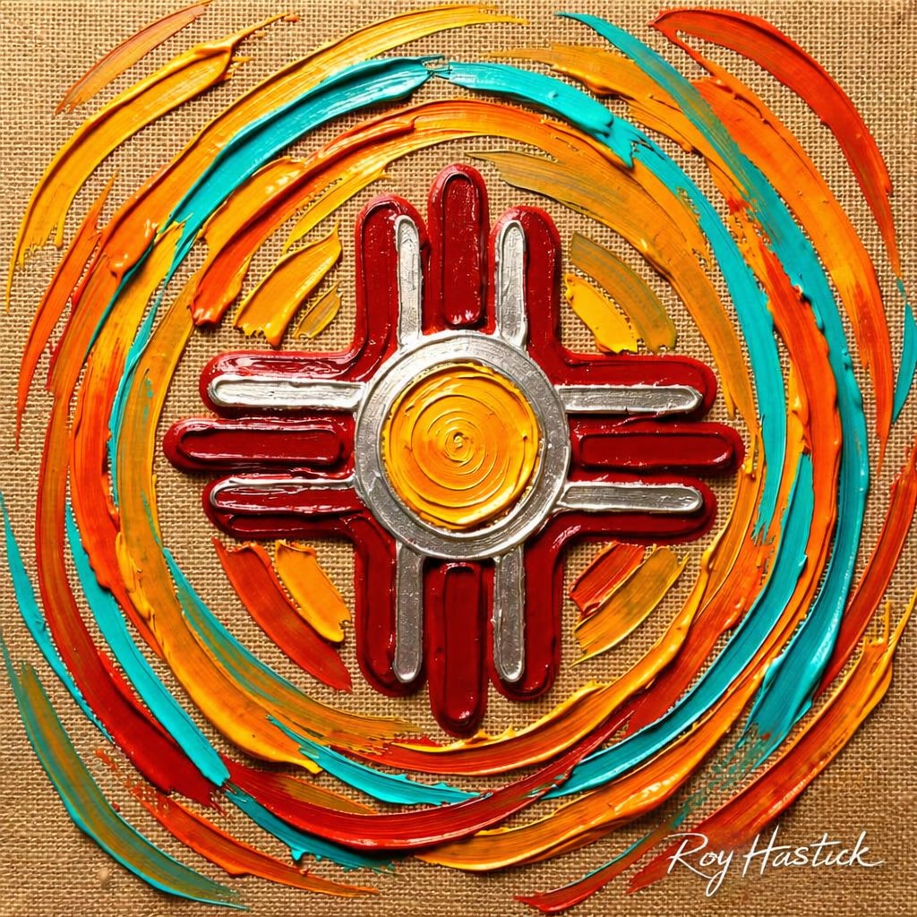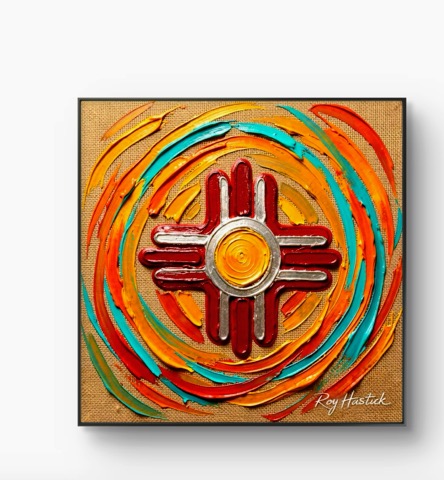 Rooted in the traditions of Northern New Mexico but expressed through a bold, modern lens, Zia Radiance is a tribute to the place we call home. As a Santa Fe artist, I wanted to capture the Zia not as a static image, but as a radiating force of energy. The heavy, tactile layers of color evoke the rugged beauty of the Sangre de Cristo Mountains and the vibrant spirit of our local art community.